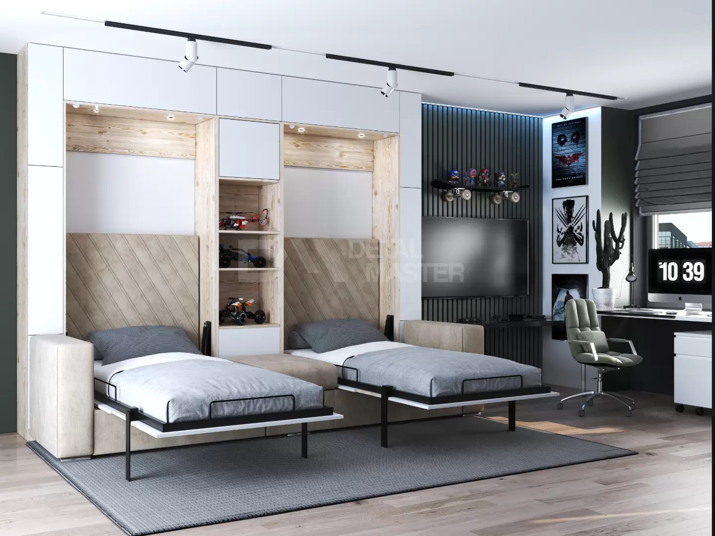 Детская шкаф-кровать с двумя спальными местами  "Twin" работает на механизме раскладывания собственной разработки "Balance". Кровать раскладывается легким движением руки, превращаясь в полноценное спальное место. Просто потяните за ножку-маятник, которая самостоятельно фиксируется в нужное положение при опускании.