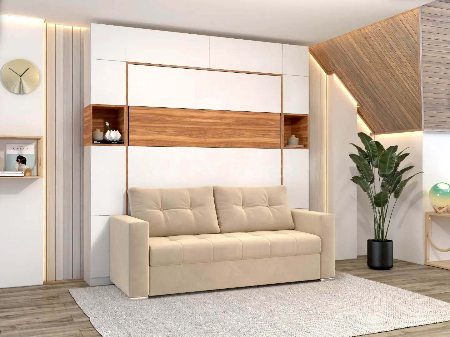 Шкаф-кровать трансформер с диваном "Comfort Space Balance" работает на механизме раскладывания собственной разработки "Balance". Кровать раскладывается легким движением руки, превращаясь в полноценное спальное место. Просто потяните за ножку-маятник, которая самостоятельно фиксируется в нужное положение при опускании.
